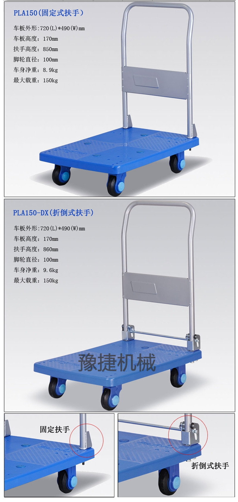 【豫捷】平板手推车由塑料车板、粉体涂装扶手(可折倒、固定)、特静脚轮(尼龙支架、铁板支架)等组成。