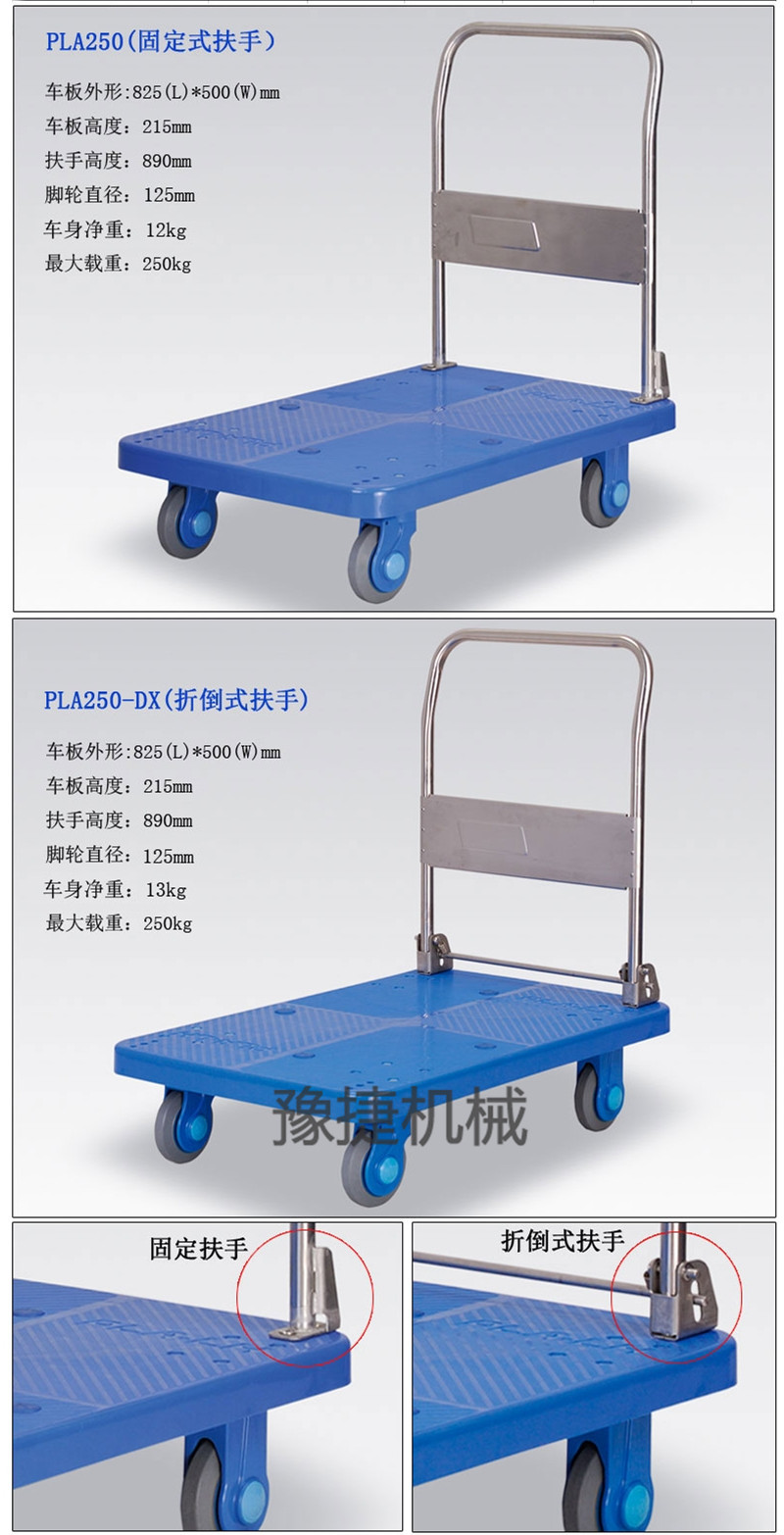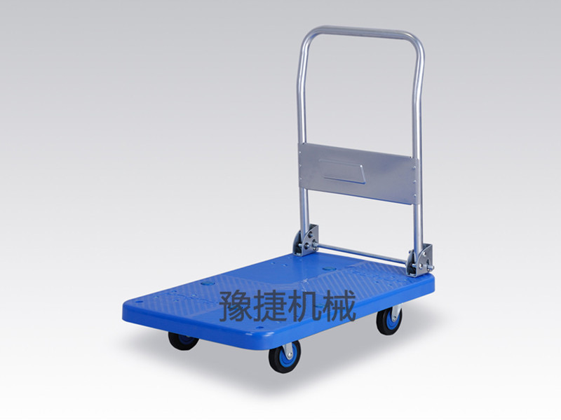 【豫捷】平板手推车由塑料车板、粉体涂装扶手(可折倒、固定)、特静脚轮(尼龙支架、铁板支架)等组成。
